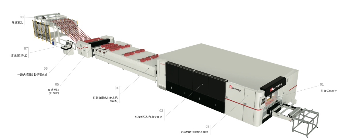 • Handway Glory1604是一款主要應用於包裝印刷行業的工業級瓦楞紙版數位四色印刷機(數位彩色印刷機),其高速的連續噴印方式,能夠確保產線能無縫換單,為使用者節省換單時間創造更高效的工作方式。